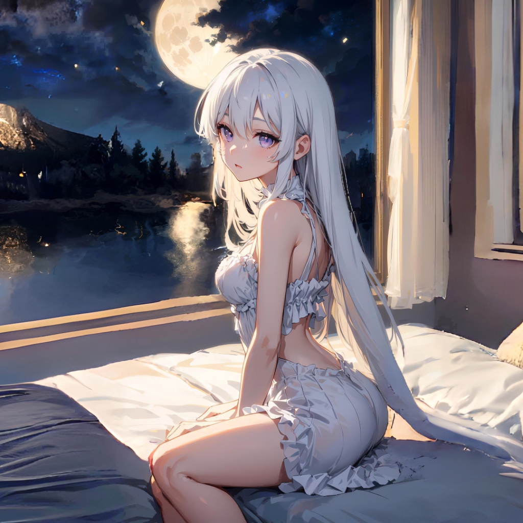 Download: anime girl white hair bed night stars lake mountain forest [Wallpaper Engine]