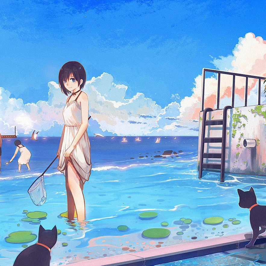 Download: Cool girl on sea beach + cats [Wallpaper Engine]